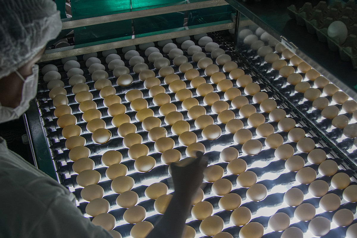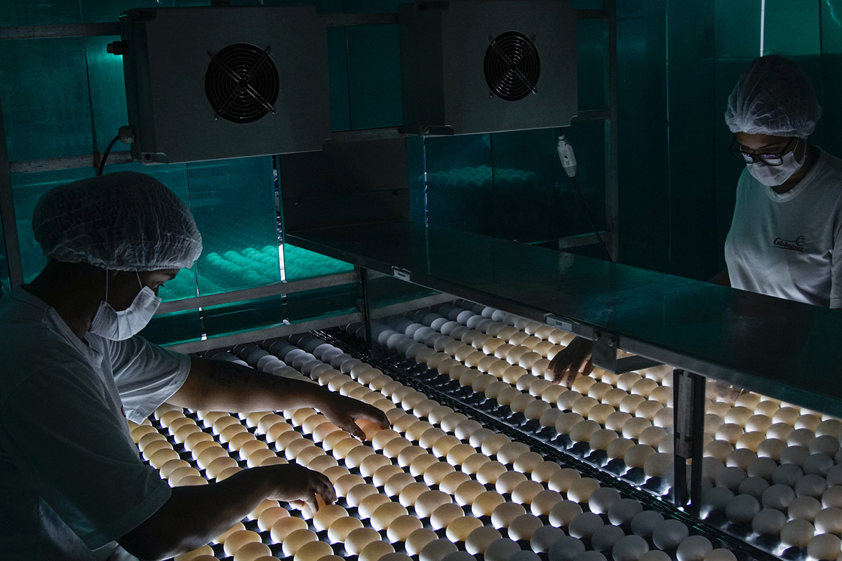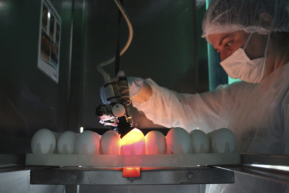 Modernas máquinas classificam os ovos por tamanho e peso. Somente os que atendem ao padrão de qualidade Globobiotech seguem para as bandejas, em que são submetidos a uma nova inspeção visual realizada por experientes operadores para serem liberados para a etapa de incubação.